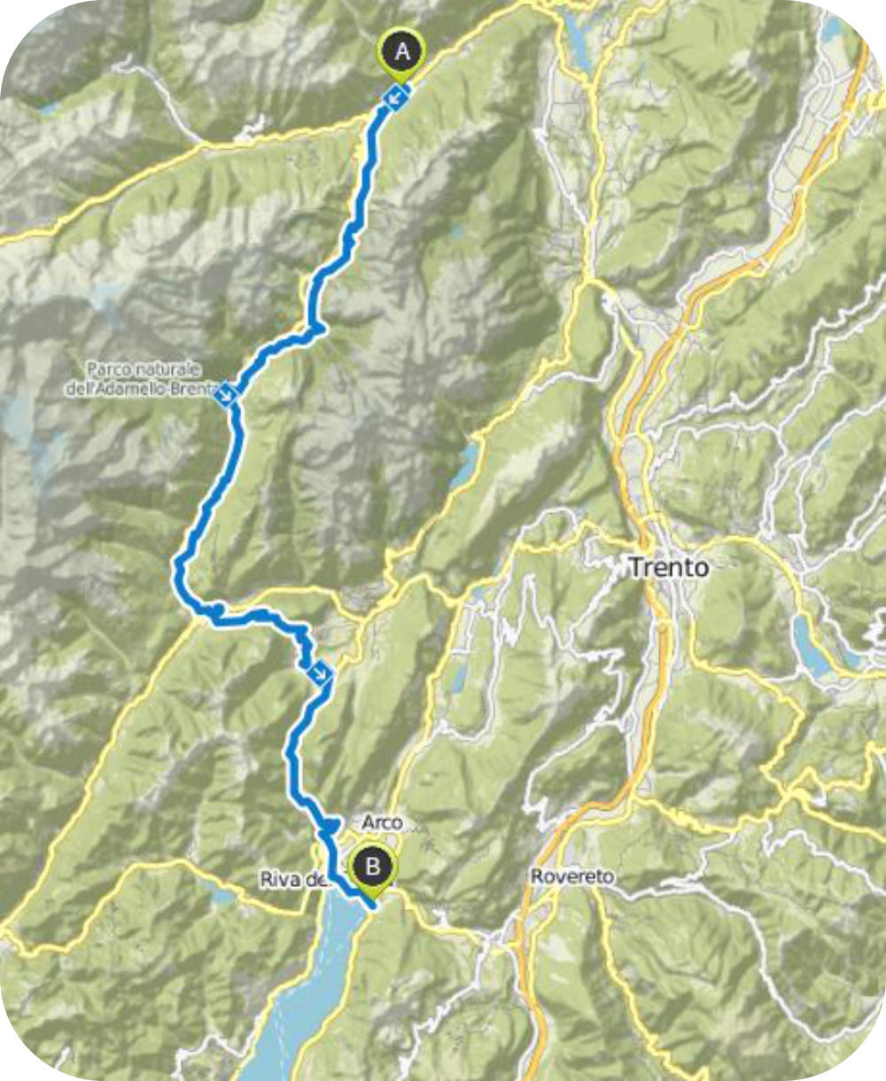 Der finale Tag auf unserer Tour. Heute Abend werden wir am Gardasee ankommen. 5 Tage körperliche Belastung werden ein Ende finden.Aufgrund des gestrigen Tages haben wir die heutige Route neu geplant. Wir werden nun über die Pässe Duron und Ballino zum Gardasee fahren. Dadurch haben wir zwar ein paar Kilometer mehr als geplant, wir sparen uns aber ca. 700 hm für die finale Strecke.Der Inhaber der Pension hat uns schon auf schlechtes Wetter (und Bären) hingewiesen, aber uns konnte nichts mehr aufhalten. Wir starten also gegen halb 9 zu unserer letzten Tour. Zuerst erreichen wir Dimaro und fahren anschließend über den Dolomitit di Brenta Radweg bis nach Madonna di Campiglio. Hier zieht der Himmel nun ganz zu und bei der Abfahrt erwischt uns ein starker Regen. Aus diesem Grund suchen wir in Pinzolo eine Pizzeria auf und versuchen das schlechte Wetter vorbeiziehen zu lassen. Gute 2 Stunden später können wir unsere Fahrt fortsetzen. Über den super ausgebauten Radweg entlang der Sarca erreichen wir Tione di Trento. Von dort beginnt der Anstieg zum Passo Duron auf ca. 1000hm. Kurz nach Fiave haben wir nur noch den Passo Ballino vor uns, bevor sich der Lago di Tenno zeigt. Nun war es soweit, kurz vor Ville Del Monte können wir den ersten Blick auf den Gardasee genießen. Geschafft, was für eine körperliche Anstrengung, die nun Ihren finalen Höhepunkt erreicht. Die Abfahrt zum Lago fliegt nur so an uns vorbei und jeder Blick auf den See wird stolz aufgesaugt. Der Ortseingang von Riva del Garda ist noch ein Höhepunkt, bevor wir nach Torbole weiterfahren. Hier begrüßt uns der Gardasee in seiner ganzen Pracht.Der Abend steht unter dem Motto „geschafft“, worauf alle bei italienischen Speißen sehr stolz sind.Weiter geht‘s auf dem Link zum Tag 6.